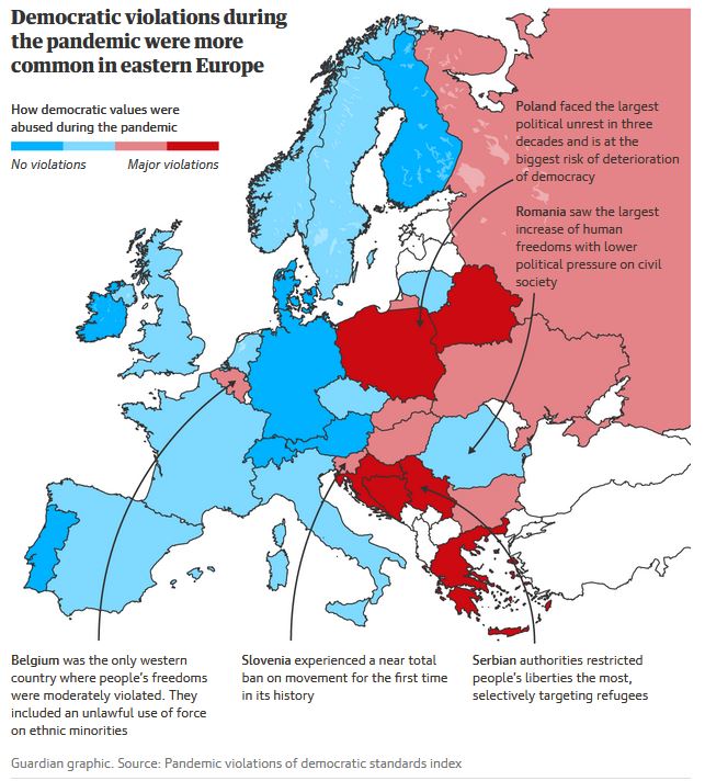 Η ανάλυση του Guardian αποκάλυψε επίσης πώς ορισμένες κυβερνήσεις της ανατολικής κεντρικής Ευρώπης με ιστορικό υπονόμευσης δημοκρατικών αρχών έχουν εκμεταλλευτεί την πανδημία για να διαδώσουν περαιτέρω αντιδημοκρατικές πρακτικές.