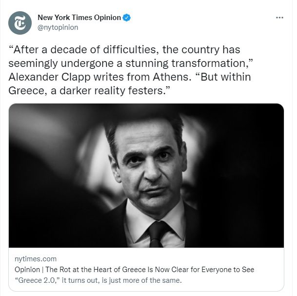 Oι New York Times ωστόσο δίνουν ξεκάθαρη απάντηση στους ισχυρισμούς του Μαξίμου περί… «εξωφυλαρούχα» καθώς εδώ και λίγες ημέρες αναδημοσιεύουν διαρκώς το άρθρο «ράπισμα» προς την κυβέρνηση του Κυριάκου Μητσοτάκη.