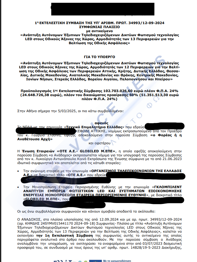 Σύμφωνα με τα επίσημα στοιχεία που παρουσίασε ο Σερέτης, η κυβέρνηση ανέθεσε το έργο σε εταιρεία που συνεργάζεται στενά με τον ΟΤΕ. Το πρόσωπο που υπέγραψε τη σύμβαση είναι στέλεχος του ΟΤΕ και εμπλέκεται και σε άλλες εργολαβίες. Το συνολικό κόστος; 102 εκατομμύρια ευρώ. Μόνο για την Αττική δόθηκαν 7,428 εκατομμύρια, για την Κρήτη 12,664 εκατομμύρια, για τη Δυτική Ελλάδα 13,844 εκατομμύρια, για τη Θεσσαλία 16,193 εκατομμύρια, για τη Δυτική Μακεδονία 9,386 εκατομμύρια, για την Ανατολική Μακεδονία και Θράκη 9,131 εκατομμύρια και για την Κεντρική Μακεδονία 16,140 εκατομμύρια ευρώ. Και η λίστα συνεχίζεται.