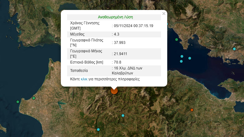 Σύμφωνα όμως με αναθεωρημένη λύση του Γεωδυναμικού Ινστιτούτου Αθηνών το επίκεντρο της δόνησης εντοπίστηκε 16 χιλιόμετρα δυτικά νοτιοδυτικά των Καλαβρύτων και το εστιακό βάθος υπολογίστηκε στα 70 χιλιόμετρα.