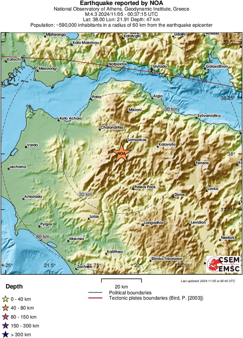 Σύμφωνα με το Γεωδυναμικό Ινστιτούτο, το επίκεντρο της δόνησης εντοπίστηκε 16 χιλιόμετρα δυτικά νοτιοδυτικά των Καλαβρύτων και το εστιακό βάθος υπολογίστηκε στα 70 χιλιόμετρα.